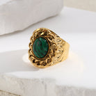 Cette bague dorée large avec chaîne en maillons et grosse pierre malachite impose un style fort et assumé. Son jeu de volumes et le contraste entre la chaîne structurée et la pierre verte profonde en font une pièce de caractère, idéale pour sublimer une tenue avec originalité.