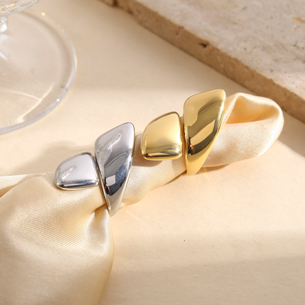 Cette bague dorée ajustable à ouverture avant asymétrique séduit par son design audacieux et contemporain. Sa ligne graphique apporte du caractère tout en restant élégante, idéale pour sublimer une tenue avec une touche de modernité.