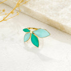 Cette bague dorée ajustable séduit par son motif de feuilles aux teintes vert menthe et émeraude. Inspirée de la nature, elle apporte une touche végétale élégante et lumineuse, parfaite pour réveiller une tenue avec douceur et fraîcheur.