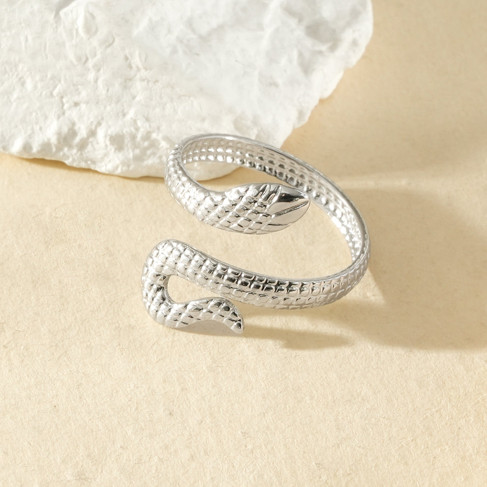 Cette bague argentée ajustable à ouverture avant serpent texturé séduit par son design audacieux et symbolique. Le serpent, travaillé en relief, apporte une note mystérieuse et contemporaine, idéale pour un look affirmé.
