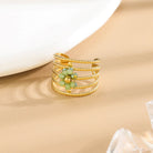 Cette bague dorée multi anneaux séduit par son design torsadé d’inspiration florale, sublimé par de délicats cristaux verts. Son jeu de volumes et de reflets apporte une touche de fraîcheur élégante à la main, pour un bijou raffiné au caractère naturel et lumineux.