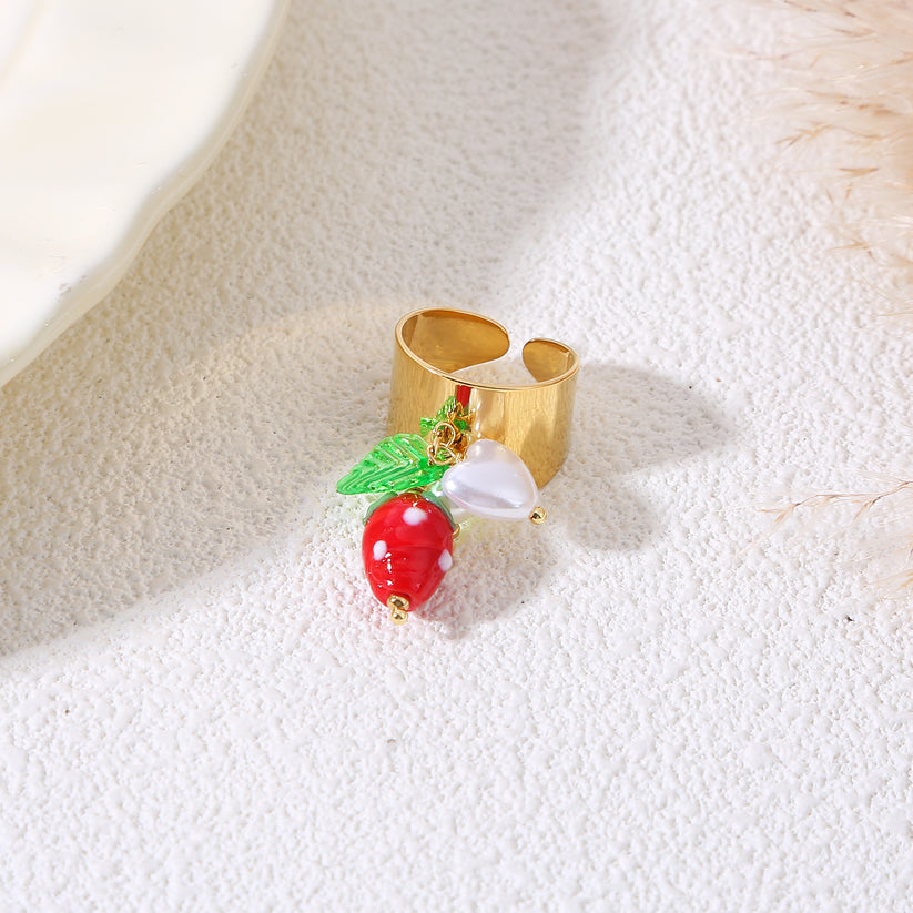 • Design : Bague large avec pendentifs fraise 🍓 et feuille 🍃
