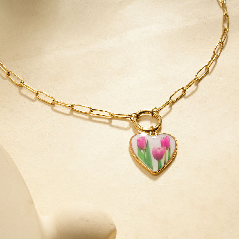 Collier Chaîne Dorée avec Fermoir et Pendentif Cœur & Tulipes