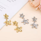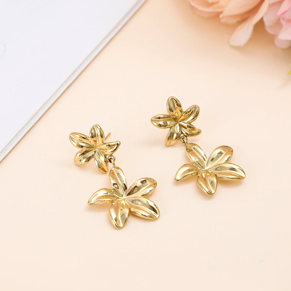 Boucles d’oreilles dorées pendantes composées de deux fleurs brillantes, délicatement superposées pour un rendu élégant et féminin. Leur design floral capte la lumière à chaque mouvement et apporte une touche raffinée au visage, sans être trop imposant.