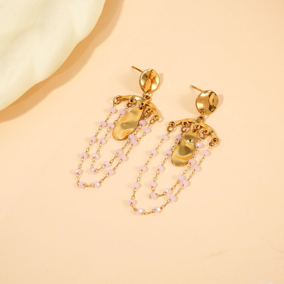 Ces boucles d’oreilles pendantes dorées martelées sont sublimées par de fines chaînettes ornées de perles roses, apportant douceur et féminité. Leur texture martelée capte la lumière tandis que les perles ajoutent une note délicate et raffinée, parfaite pour illuminer vos looks du quotidien comme ceux des grandes occasions.