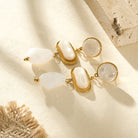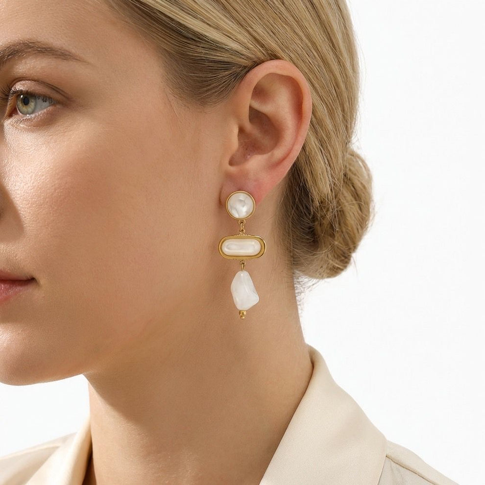 Ces boucles d’oreilles dorées pendantes associent des cabochons ronds et ovales en résine blanche à l’effet nacré délicat. Leur design élégant joue sur les formes et la lumière pour offrir un rendu doux et sophistiqué, parfait pour illuminer le visage avec subtilité.