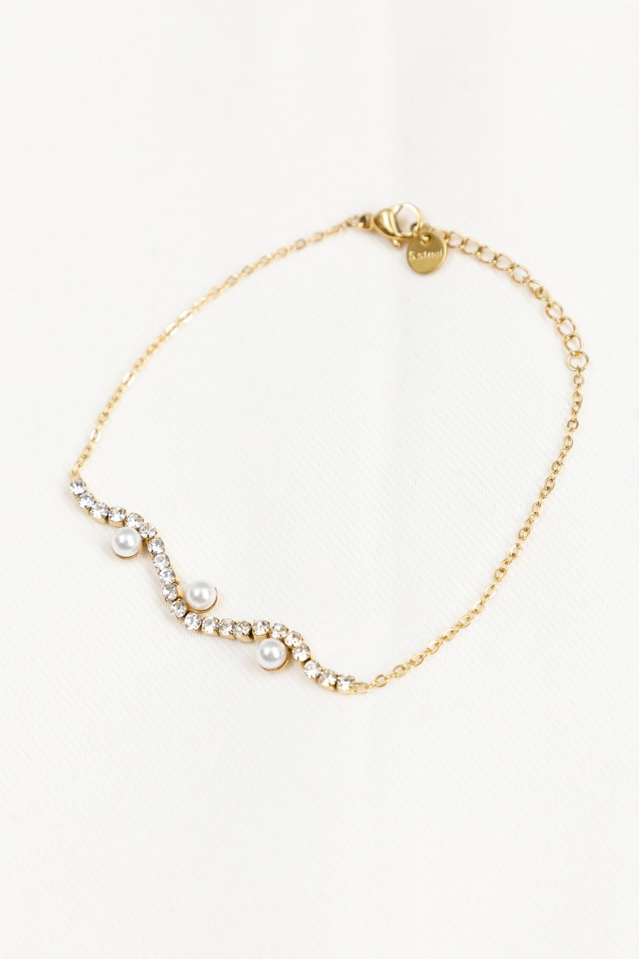 Ce bracelet à chaîne fine dorée est sublimé par trois perles blanches et des strass, pour un bijou raffiné et élégant. Parfait pour apporter une touche subtile et lumineuse à toutes vos tenues.