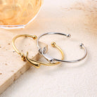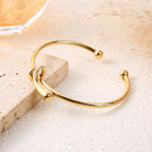 Ce bracelet jonc ajustable doré avec nœud central sculpté et extrémités boule se distingue par son design délicat et sa finition brillante. Il apporte une touche chic et sophistiquée à votre poignet, parfait pour toutes les occasions.