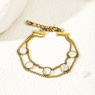 Ce bracelet double chaîne se distingue par ses cinq ronds en nacre, apportant une touche raffinée et lumineuse au poignet. Un bijou délicat et élégant, idéal pour sublimer vos tenues au quotidien ou pour une occasion spéciale.