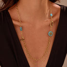 Succombez au charme du collier sautoir double chaîne dorée, sublimé par de superbes pierres turquoises et des détails ethniques finement sculptés. Son allure boho-chic apporte une touche lumineuse et dépaysante à toutes vos tenues. Fluide, long et structuré, il met en valeur le décolleté et crée un style unique, à la fois élégant et spontané.