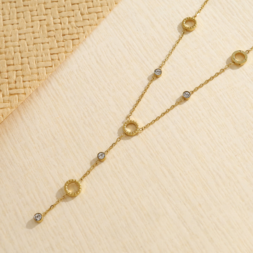 Collier doré chaîne fine en Y orné de cercles texturés et strass . Tous nos produits sont fabriqués en acier inoxydable, un matériel qui résiste à l'eau et ne se rouille pas dans le temps. Ils sont garantis sans nickel, sans cadmium et sans sel de plomb.