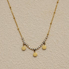 💫 Ce collier doré associe une chaîne fine étincelante à une rangée de strass et trois pampilles rondes lisses, offrant un rendu à la fois raffiné et moderne.