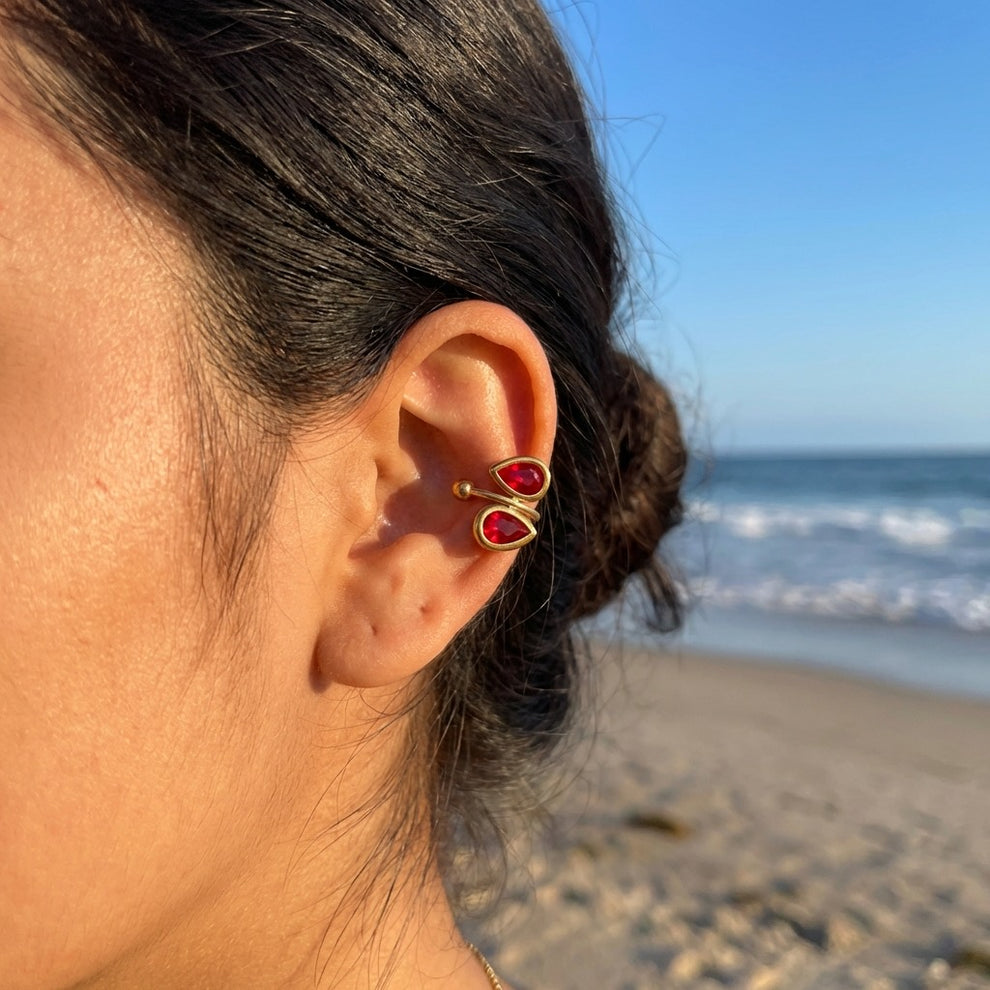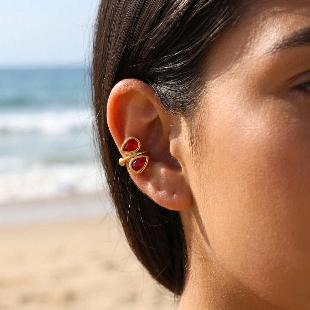 Cette earcuff dorée est sublimée par deux strass rouges en forme de goutte, apportant une touche vibrante et sophistiquée à l’oreille. Son design lumineux et raffiné habille le regard avec caractère, sans nécessiter de perçage.