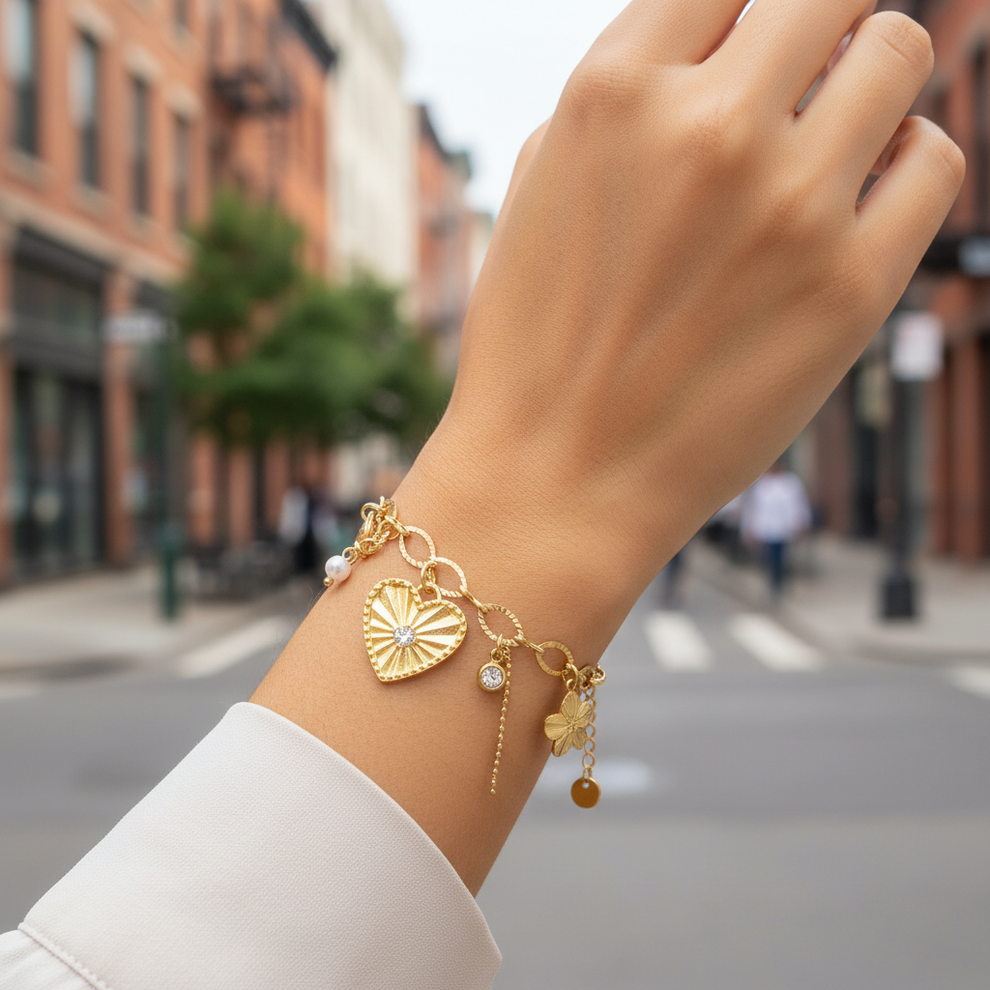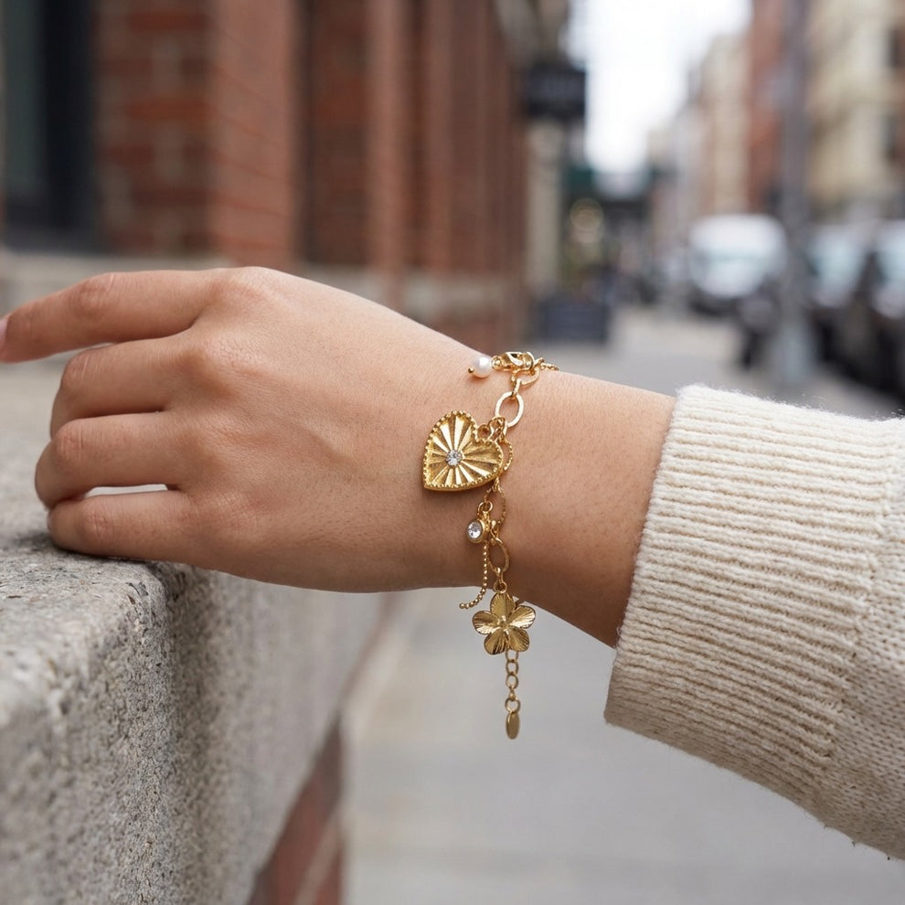 Ce bracelet doré à maillons ovales est sublimé par des charms raffinés : un cœur strassé lumineux, une fleur délicate et une perle élégante. Un bijou harmonieux qui allie douceur et éclat, idéal pour apporter une touche féminine à toutes vos tenues.