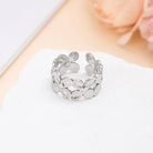 Cette bague argentée ouverte est ornée de fleurs délicatement sculptées, apportant une touche féminine et raffinée à votre main. Son design floral en relief capte la lumière et sublime votre style avec douceur et élégance.