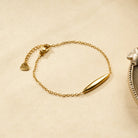 La finesse de la chaîne met subtilement en valeur le poignet, tandis que la goutte dorée apporte une touche lumineuse et raffinée sans en faire trop.