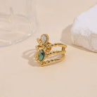 Bague dorée aux trois anneaux perlés, sublimée par une pierre verte marquise au centre et un strass goutte blanche qui ajoute une touche d’éclat. Un design travaillé, élégant et féminin, qui joue sur les volumes et la lumière pour attirer tous les regards.