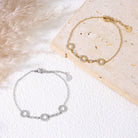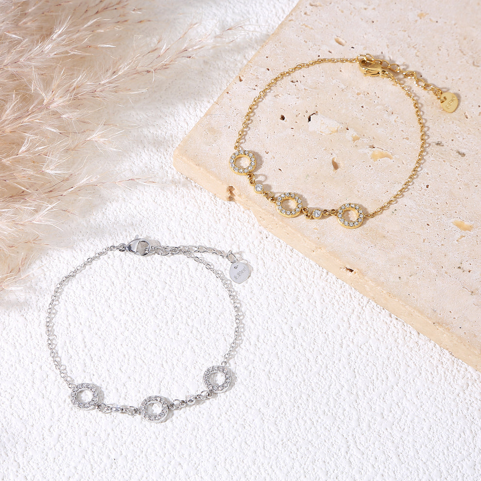 Un bracelet fin et élégant, composé d’une chaîne argentée ornée de trois pampilles cercles strassés. Discret mais lumineux, il capte délicatement la lumière pour sublimer le poignet avec finesse. Parfait pour un look chic, moderne et minimaliste.