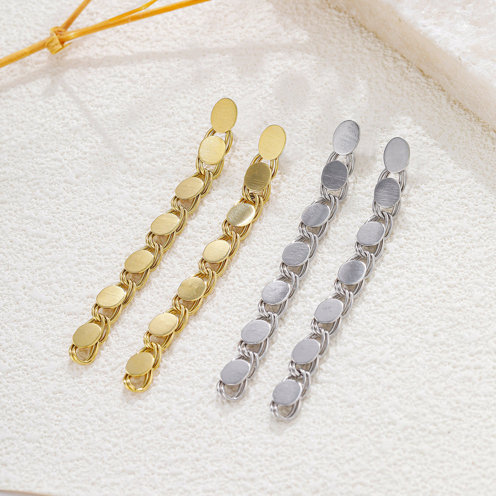 Boucles d’oreilles pendantes dorées composées de maillons ronds lisses, au design moderne et élégant. Leur silhouette allongée apporte une touche chic à toutes vos tenues, de jour comme de nuit.