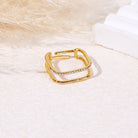 Cette bague dorée ajustable carrée, avec une branche ornée de mini strass ronds et une branche lisse, combine élégance et raffinement pour sublimer vos doigts en toute occasion.
