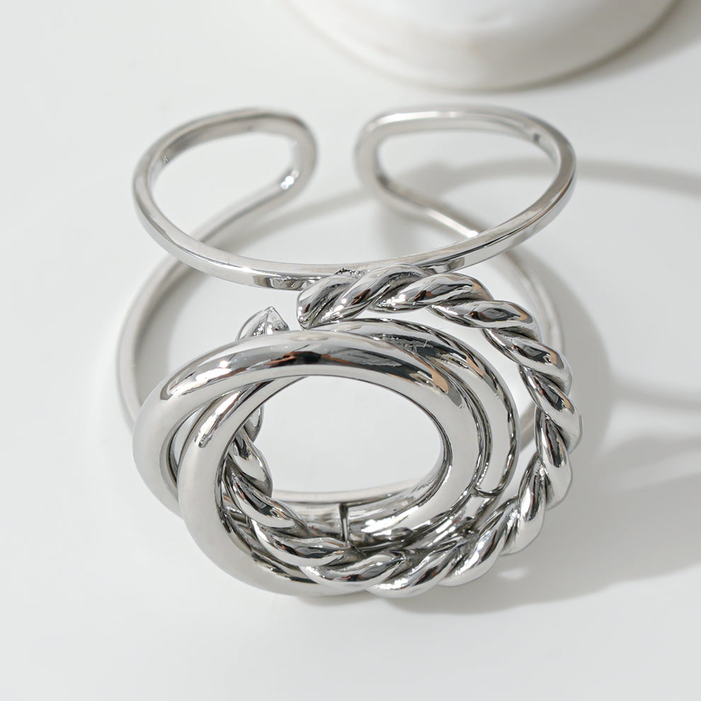 Bague argentée creuse au design travaillé, mêlant des anneaux lisses et tressés pour un jeu de textures subtil et moderne. Sa structure ajourée apporte de la légèreté tout en affirmant un style élégant et actuel, parfait pour sublimer une tenue du quotidien comme une silhouette plus sophistiquée.