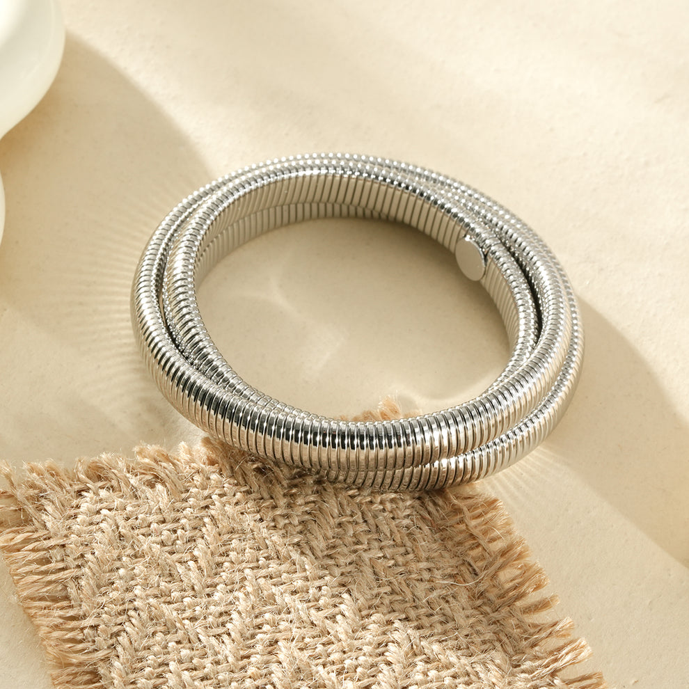 Ce bracelet jonc triple tour argenté style tubogas séduit par son design contemporain et sa finition élégante. Sa structure triple tour apporte un effet graphique et sophistiqué à votre poignet.