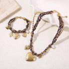 Ce collier billes dorées mêlées à un tissu léopard, sublimé par des charms cœurs et un grand cœur ouvrant façon porte-photo, affirme un style fort et assumé. Une pièce statement qui joue sur le contraste entre esprit sauvage et symbolique romantique.